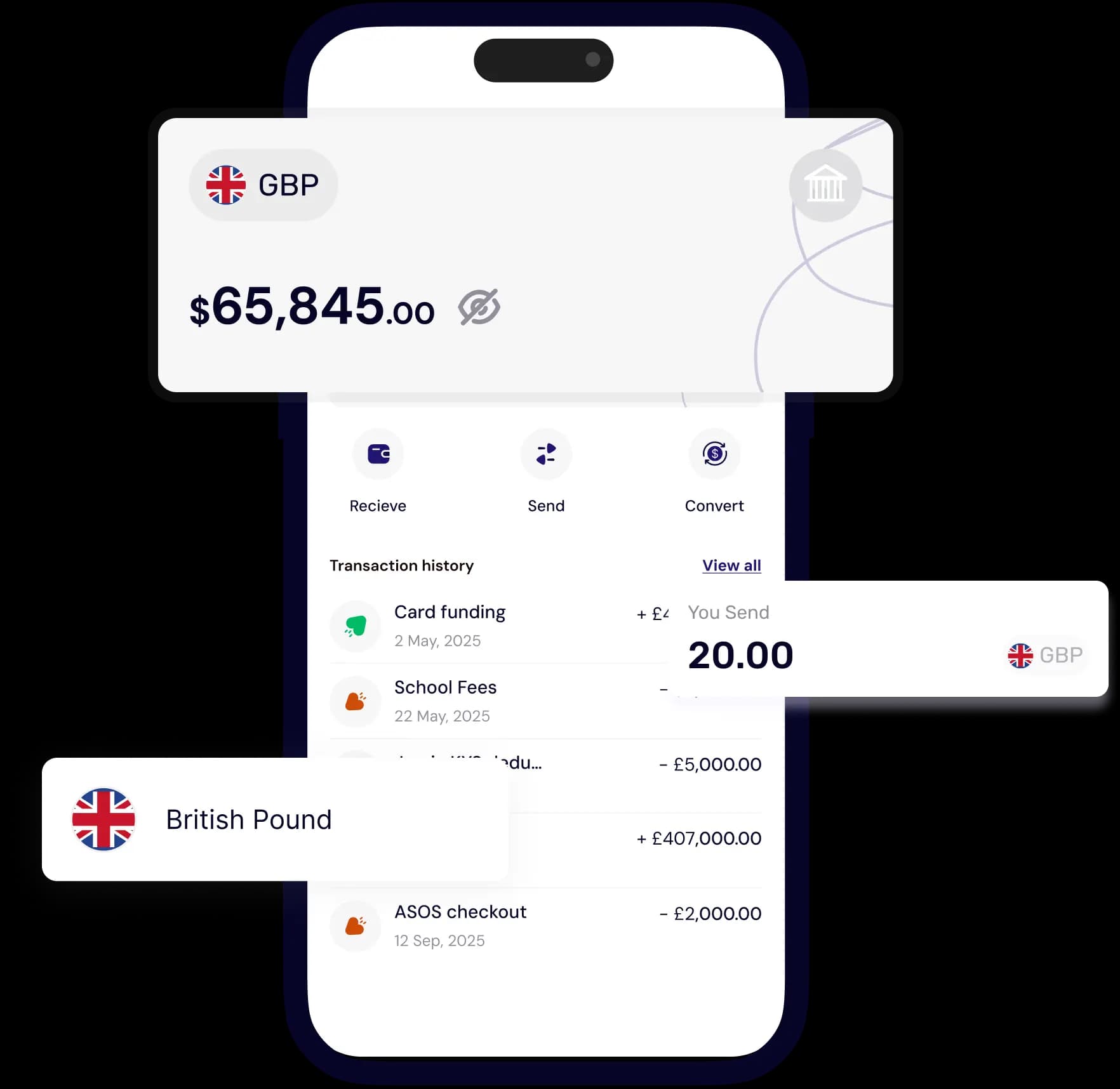 Receive GBP from the UK, clients, companies, family, or friends. Perfect for freelancers, remote workers, creators, and businesses who earn from the United Kingdom.