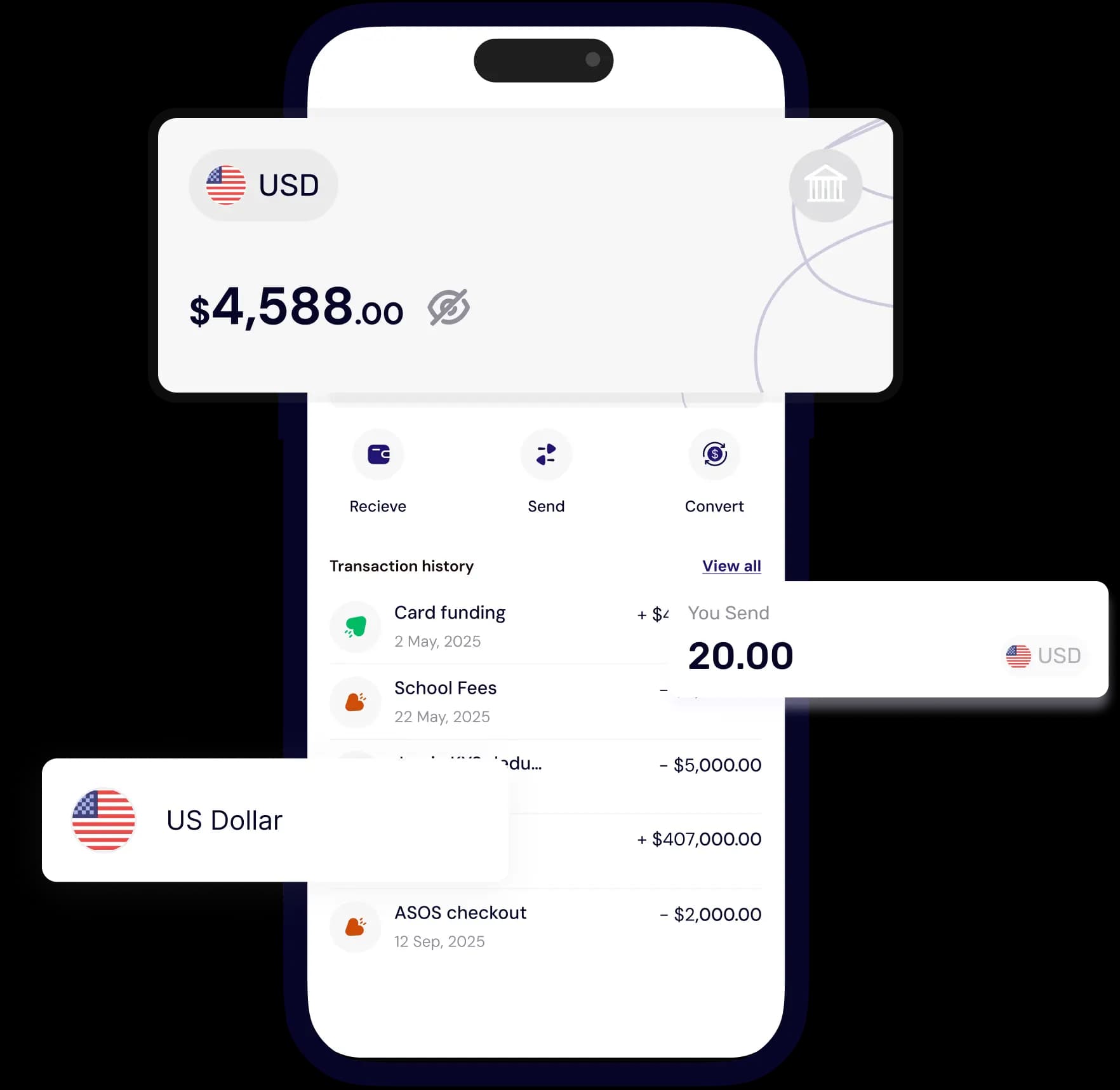Move your money to bank accounts, fund your virtual dollar card, or pay for ‘things’ globally.